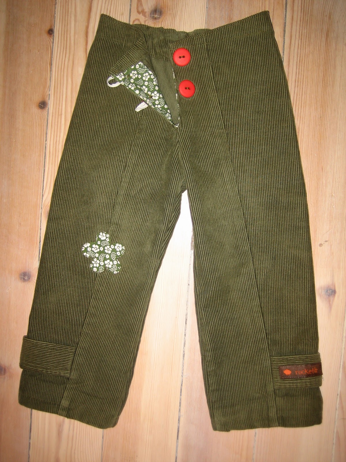 | Bukse - Rockefår redesign "Hvor er jakka mi - her er buksa di" Grønn (mose eller militær) smalstripet cord, med små detlajer av vintage stoff Str. 2-3år Kr 249,- +evt. porto |